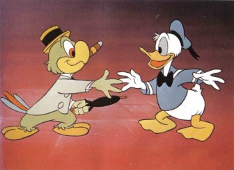 em fatias finas como papel no qual o Donald diz que não pode suportar isso. Então, os três venderam a vaca por um punhado de feijões mágicos. Pensando que o Mickey foi